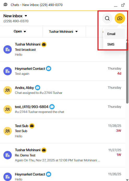 Ans: You will be able to see all the inboxes assigned to the current logged-in user in the configured team. The screenshot below of the chat widget on Contact shows the inbox selector.