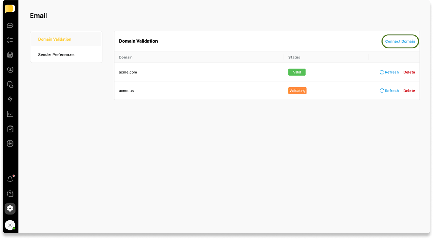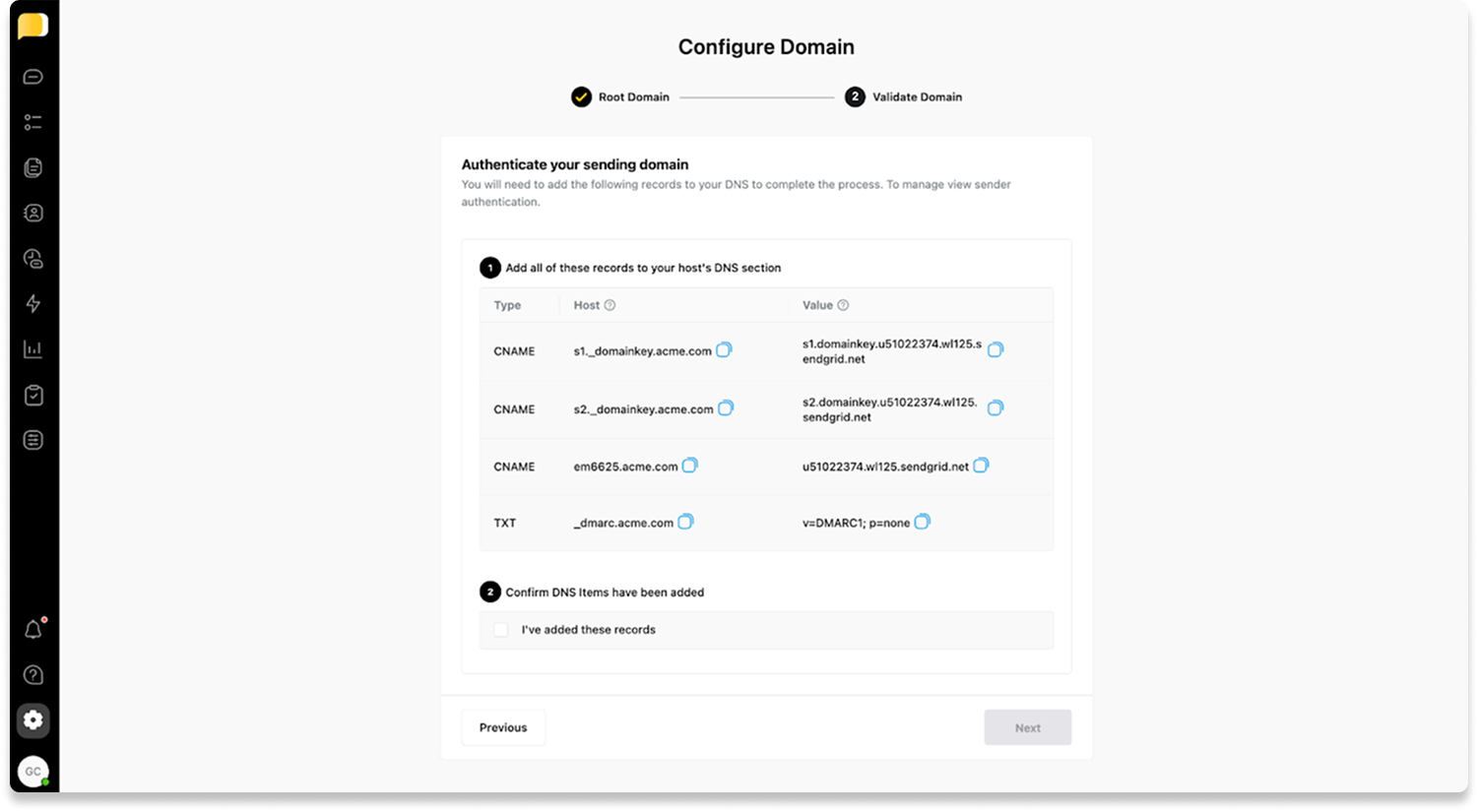 Enter the Sending Domain: Root or Sub-domain: Heymarket supports both root domains and sub-domains. We recommend using a sub-domain (for example,