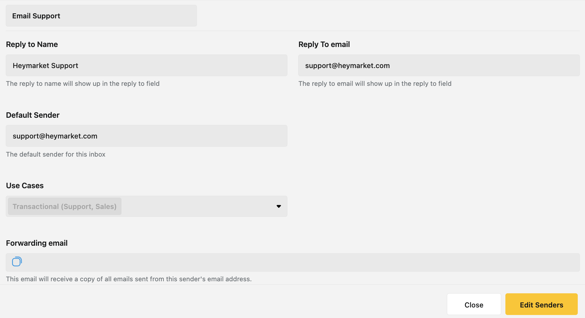 - Inbox: The Heymarket inbox associated with this sender. Determines where replies are routed.