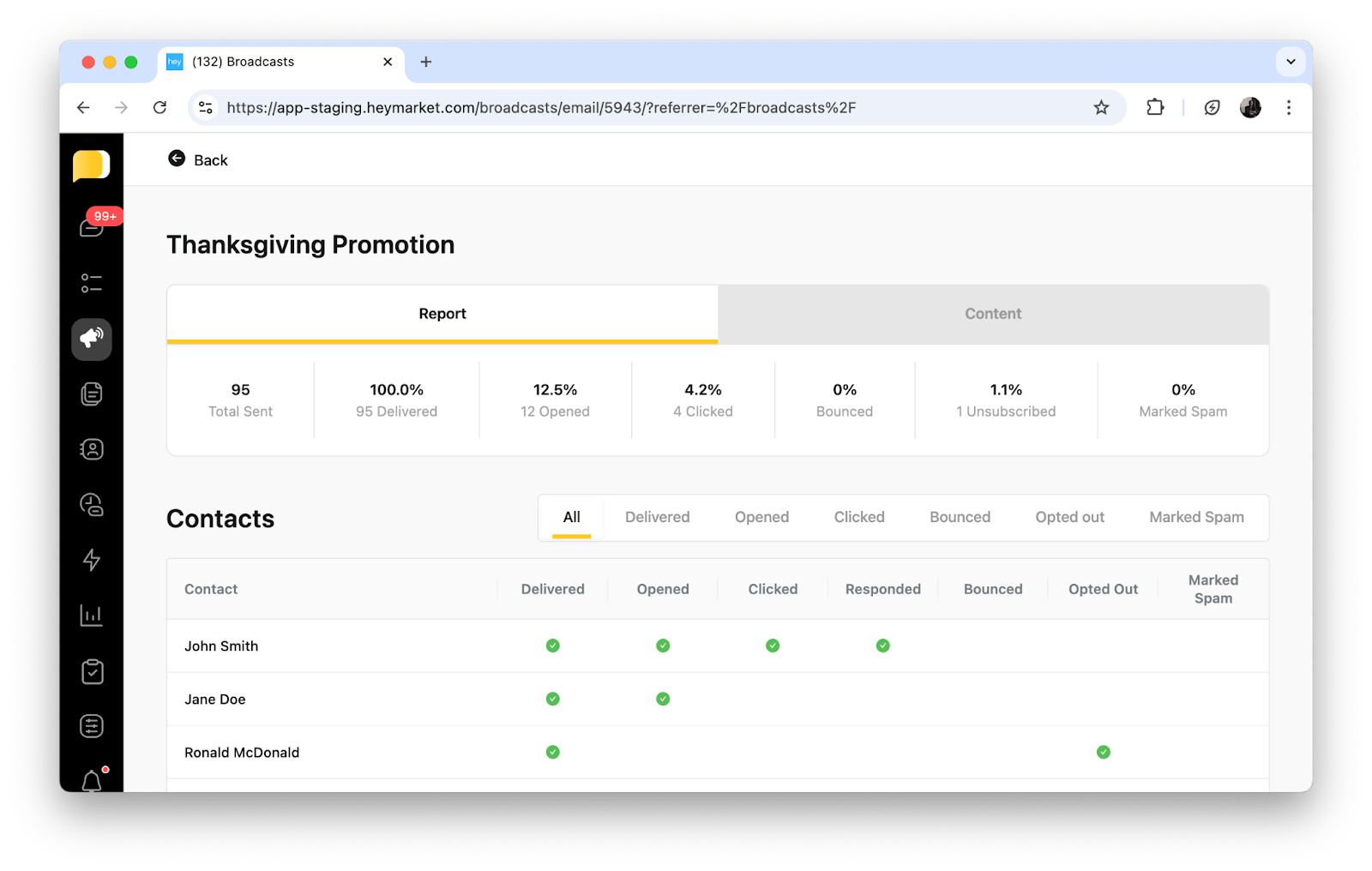 When sending a Broadcast email, Heymarket shows two levels of reporting: