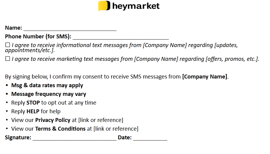 - Signature or Checkbox – Have the customer sign or check a box to confirm consent. This ensures the opt-in is explicit and not assumed.