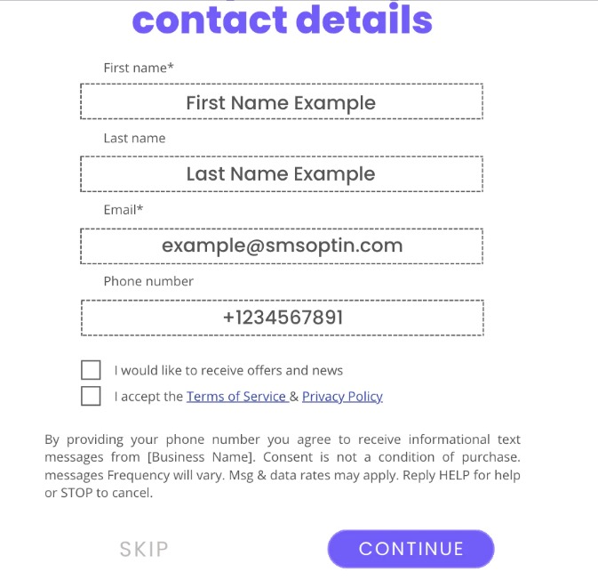 While privacy policies and terms and conditions can provide additional context, we recommend that they should not be the sole method of collecting opt-in consent. Avoid relying solely on these documents to vaguely state that customers will be contacted. Consent should be presented as an optional opt-in, with the communication channel stated (i.e. SMS), and clear, explicit methods of consent collection should be used to ensure compliance and transparency.