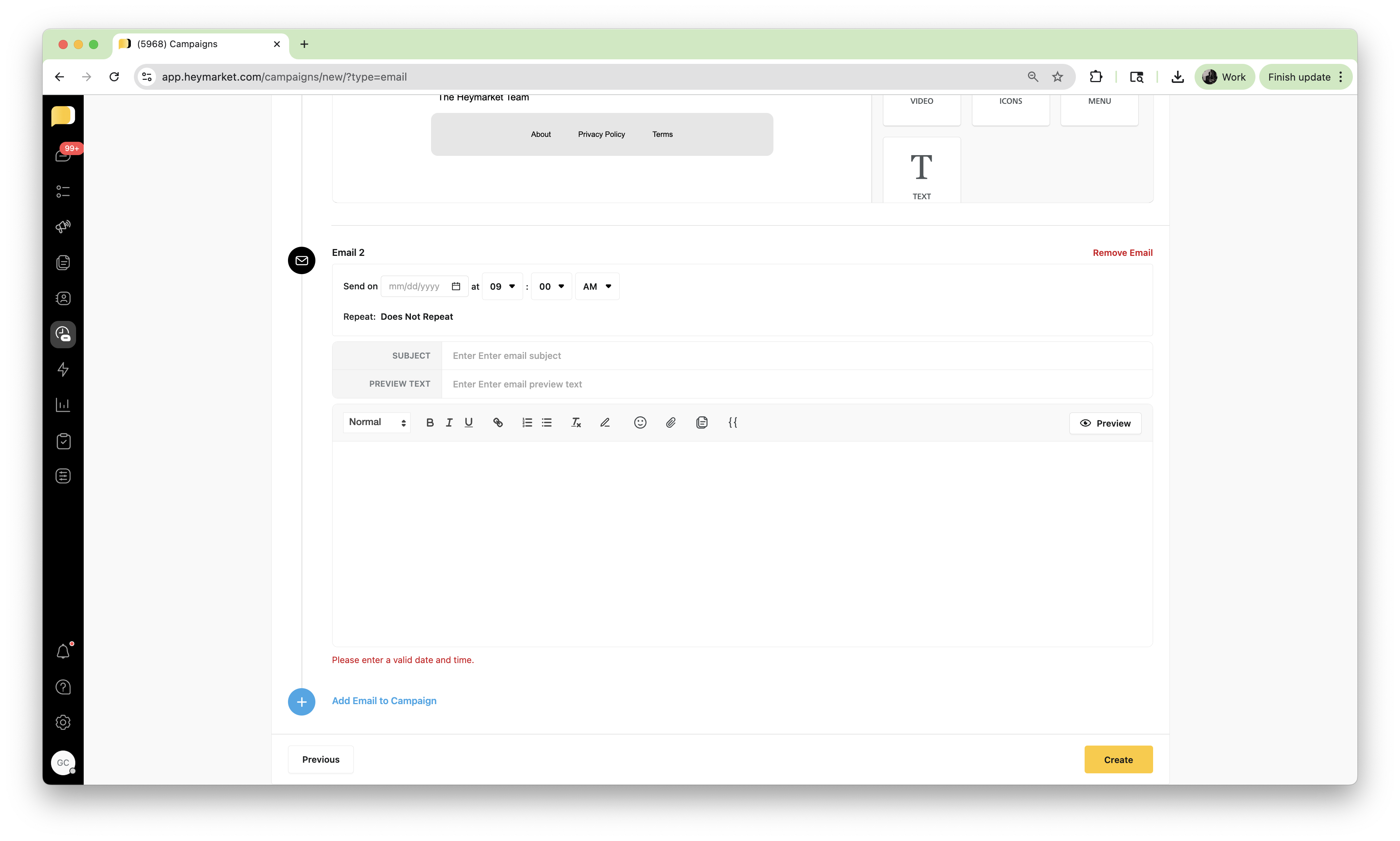 ⚠️ Note: Email must be enabled in your Heymarket workspace to use email or mixed campaigns.
