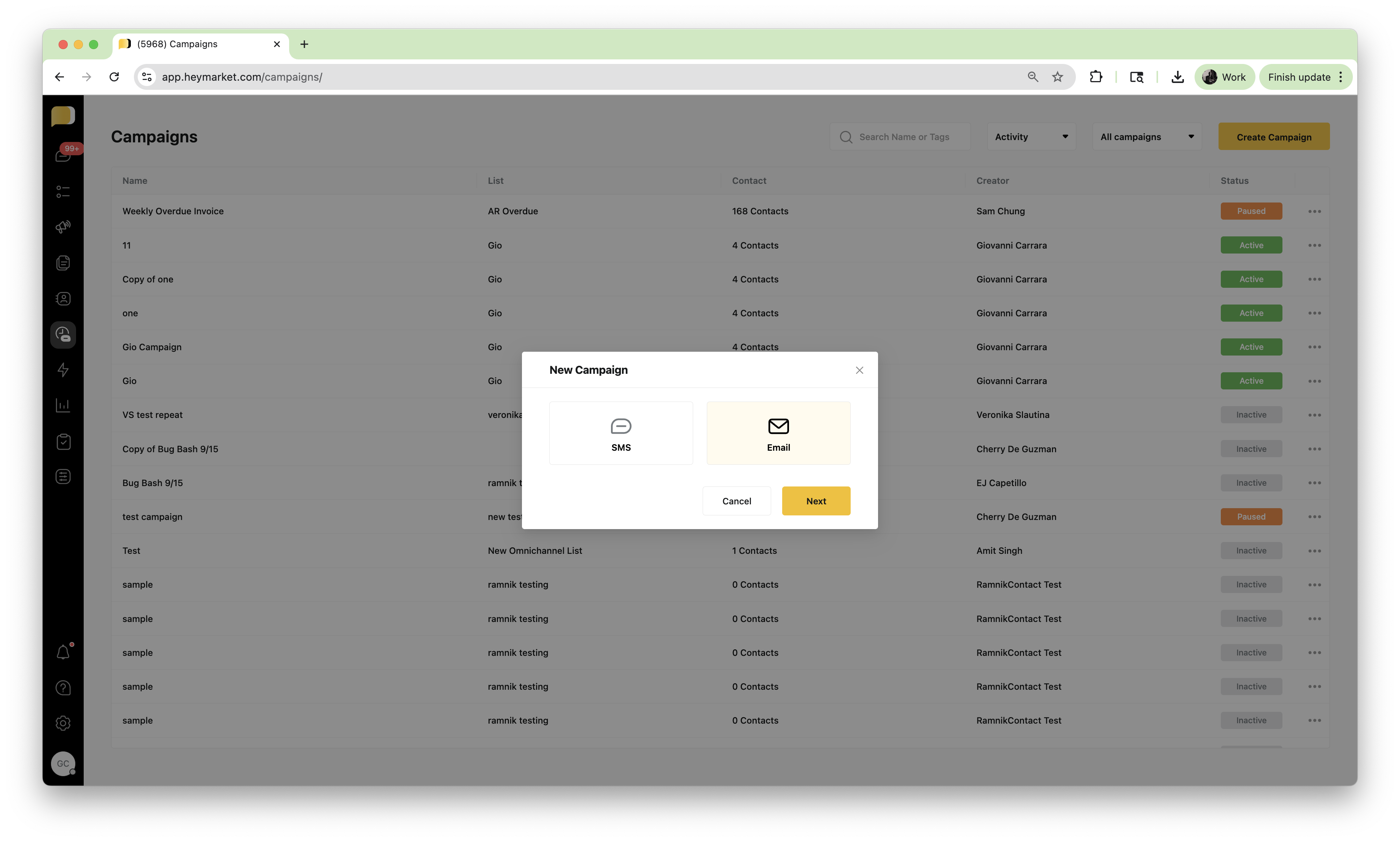 From the Campaigns page, click Create Campaign (top right). Choose Email as the channel and click Next: