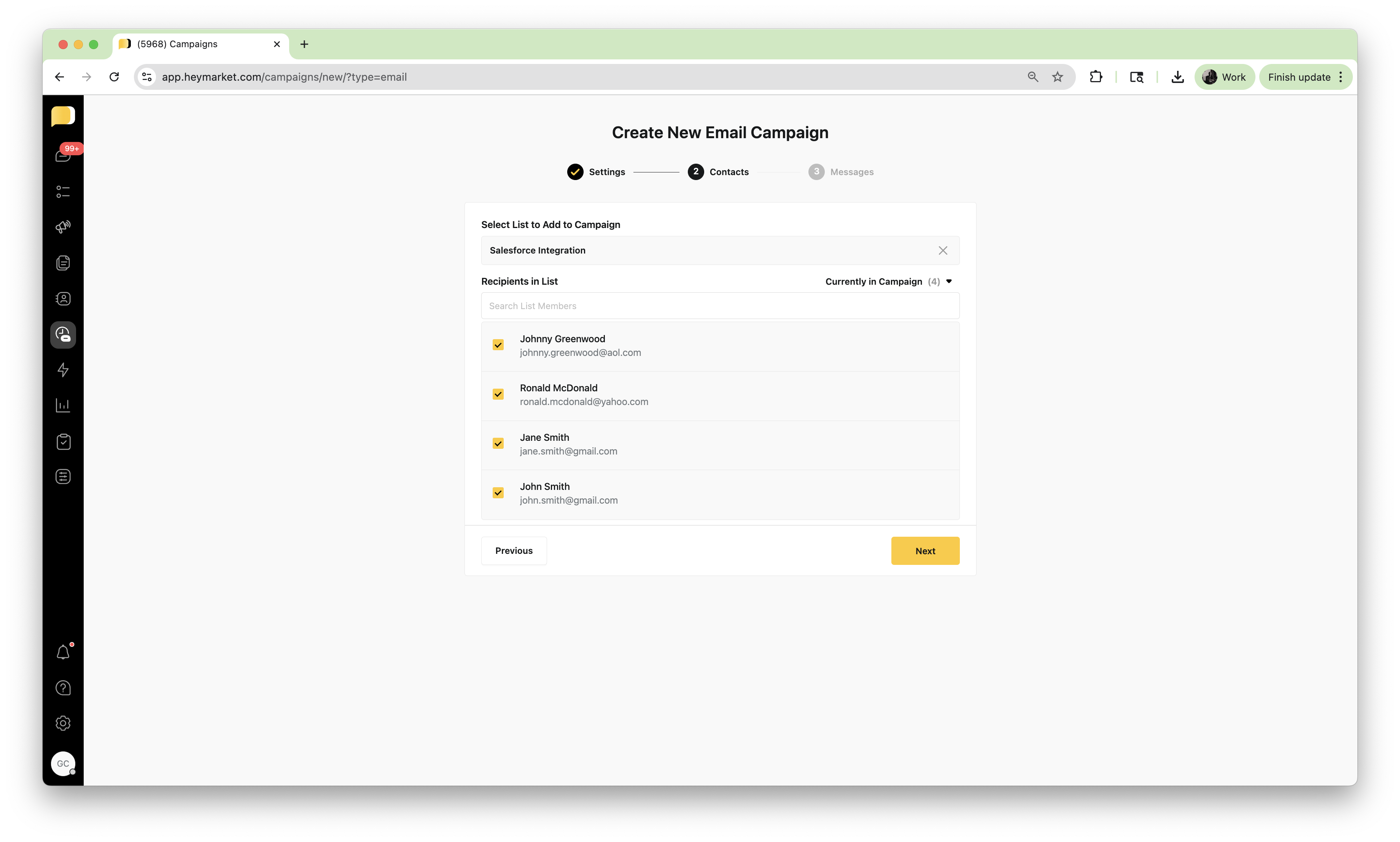 Choose the list you want to use, e.g. Salesforce Integration. Select recipients from the list (e.g. Johnny Greenwood, Ronald McDonald, Jane Smith, John Smith). Confirm the contacts are checked, then click Next.
