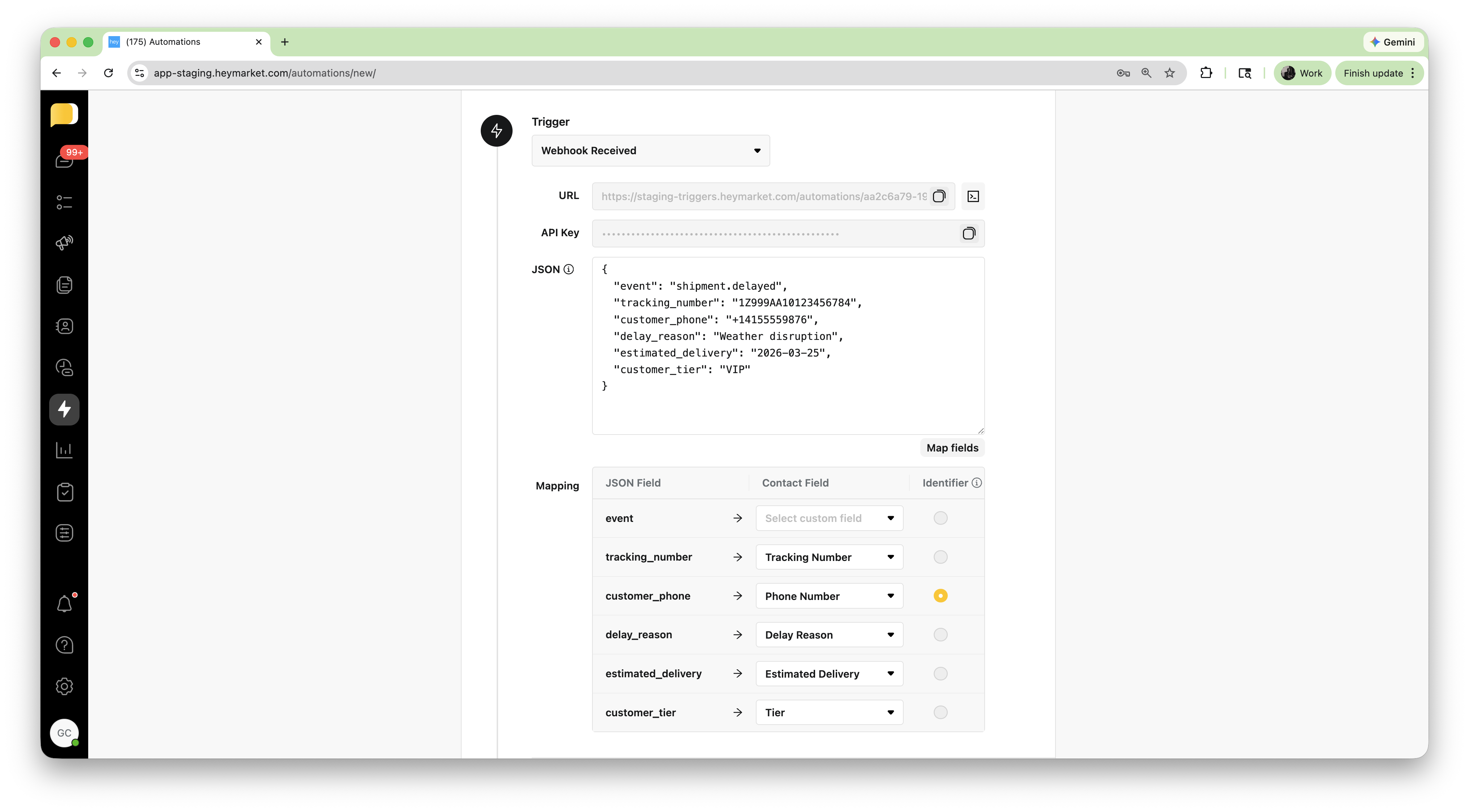 - Heymarket generates a Webhook URL and API key.