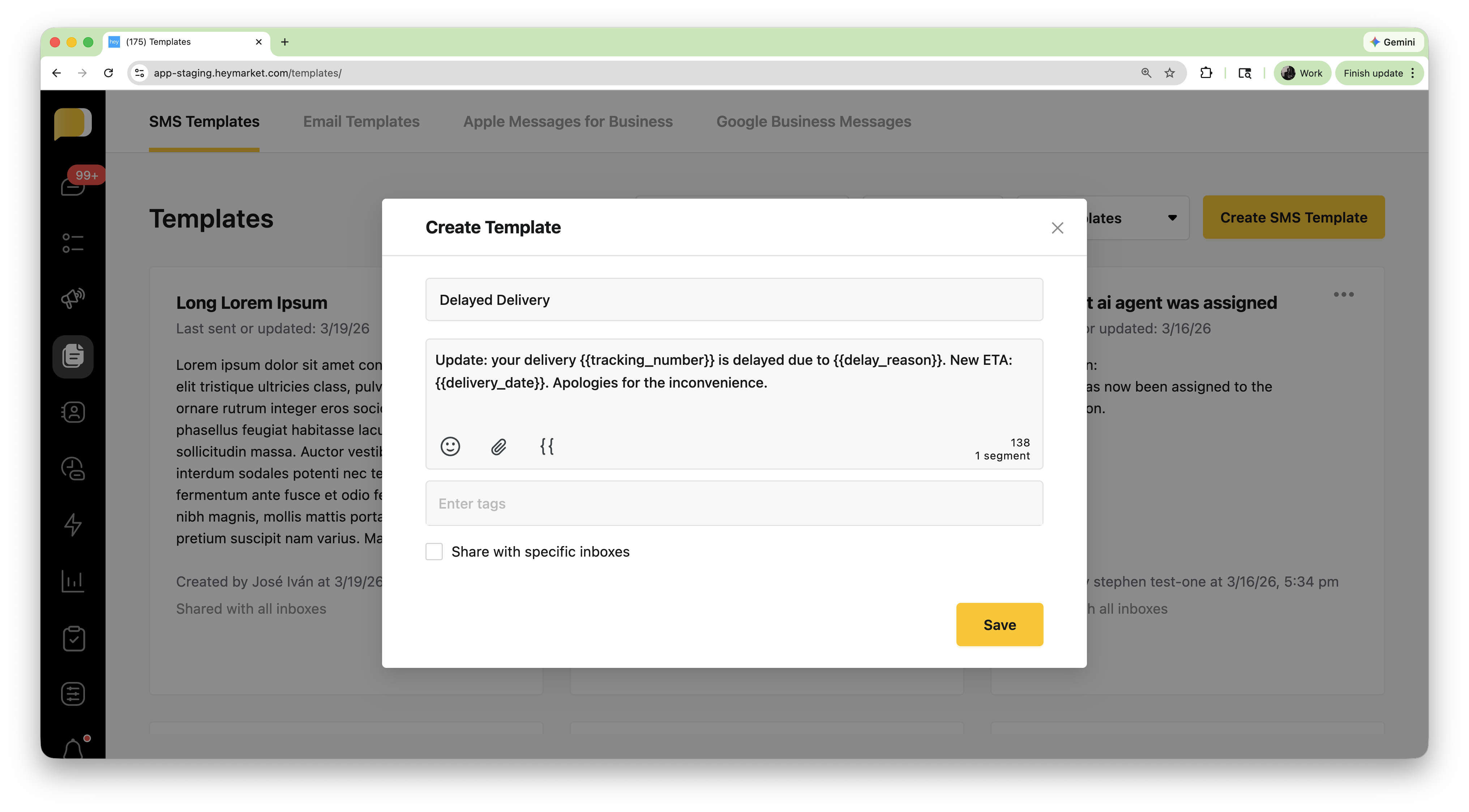 Your logistics provider updates shipment status. When a delay occurs, it sends a webhook to Heymarket to notify the customer before they reach out