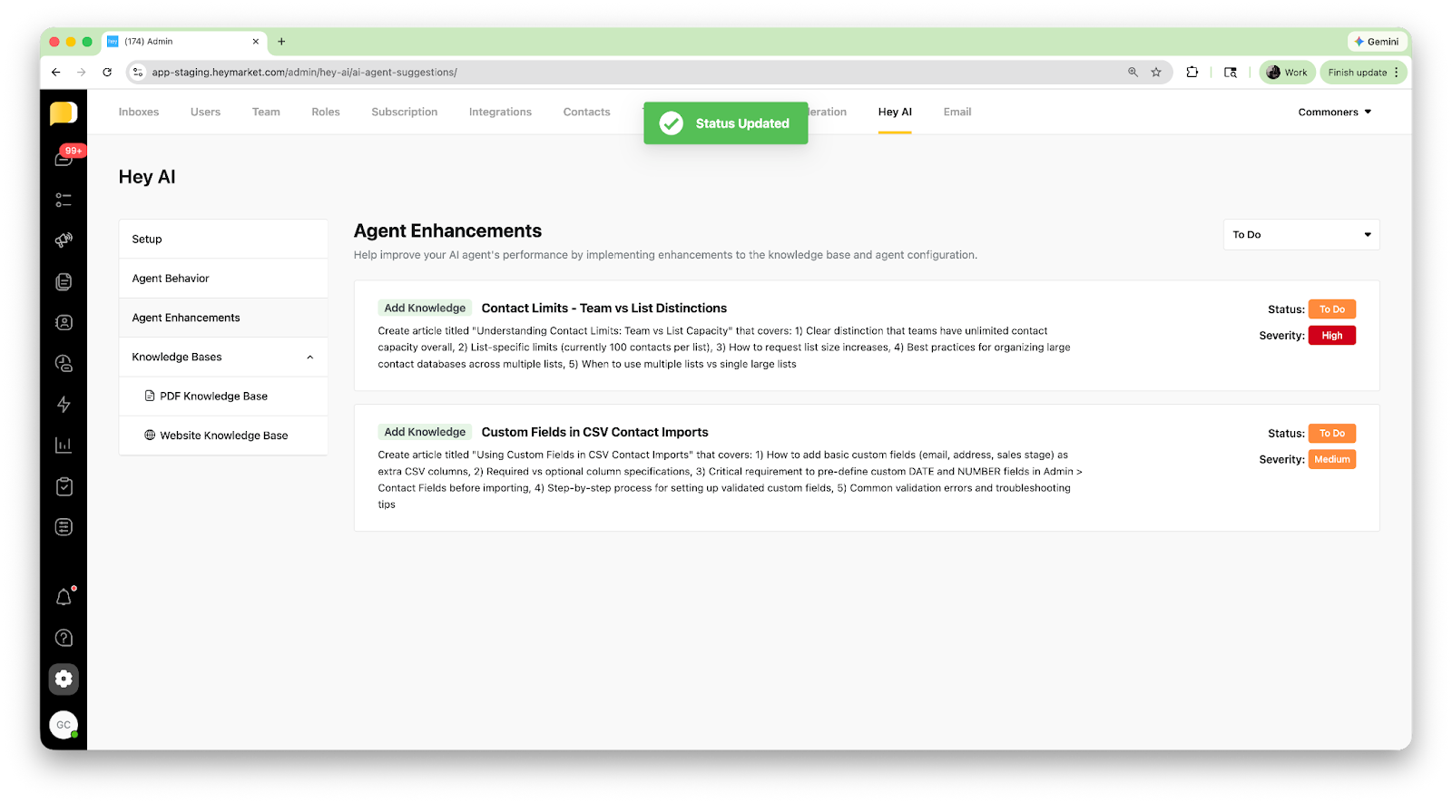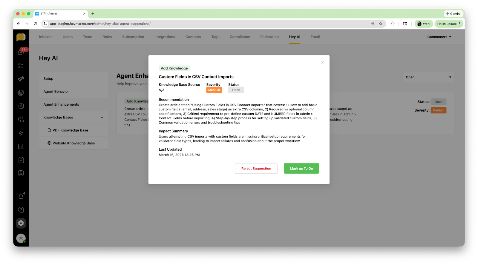 Heymarket runs a daily job that automatically analyzes the feedback submitted by your team. When a pattern is identified — such as repeated incorrect responses or a common knowledge gap — it creates an Agent Enhancement suggestion for you to review.
