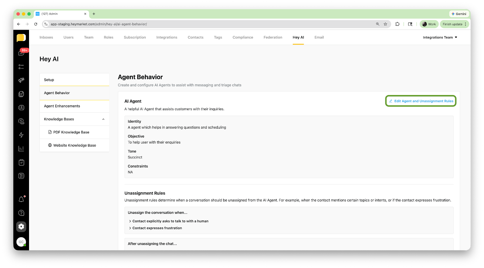 Go to Admin > Hey AI > Agent Behavior: https://app.heymarket.com/admin/hey-ai/ai-agent-behavior/ and click Edit Agent and Unassignment Rules.