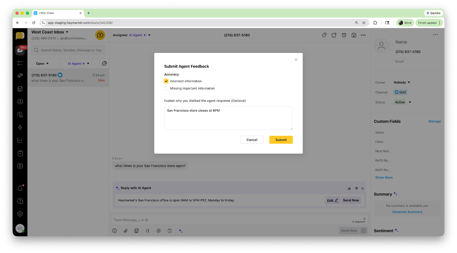 You can also add a note to explain what was wrong (for example, "San Francisco store closes at 6PM, not 5PM"). This feedback helps improve the agent's responses over time.